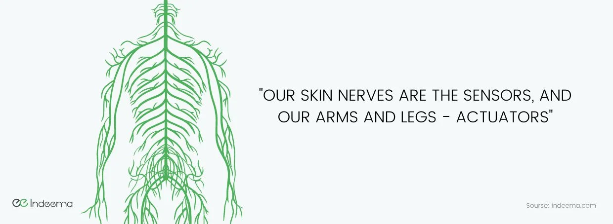 Imagine your hand being burned. Not a good feeling, but allow us to draw a comparison for a moment. The skin nerves can be compared to sensors, the brain to the control system, and the limbs and body movements that direct an arm away from danger can be compared to actuators.
