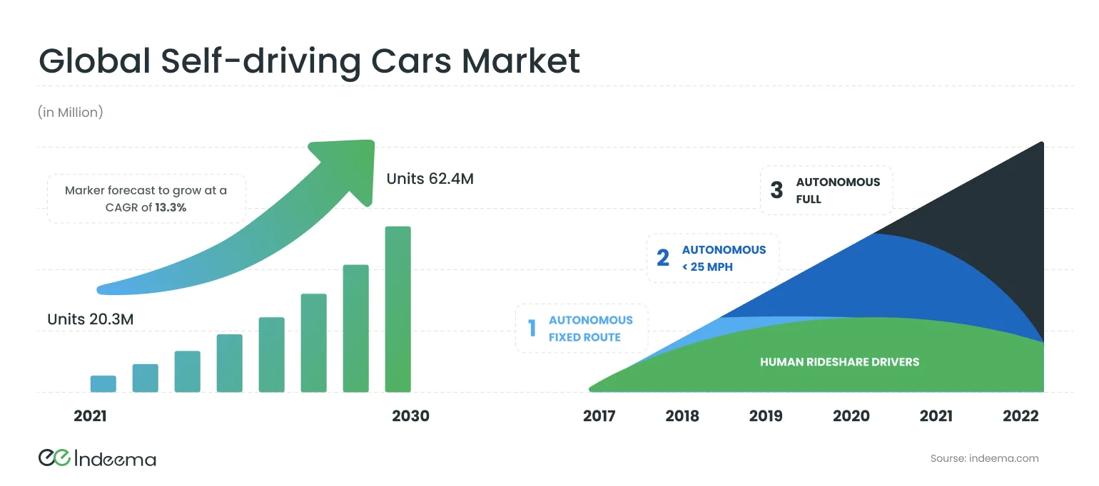 The global market for autonomous automobiles is expected to grow to 62.4 million units in 2030 from 20.3 million units in 2021 at a CAGR of 13.3%. Preference for driver assistance systems and strict safety standards to create a safer driving environment are key factors propelling this growth.