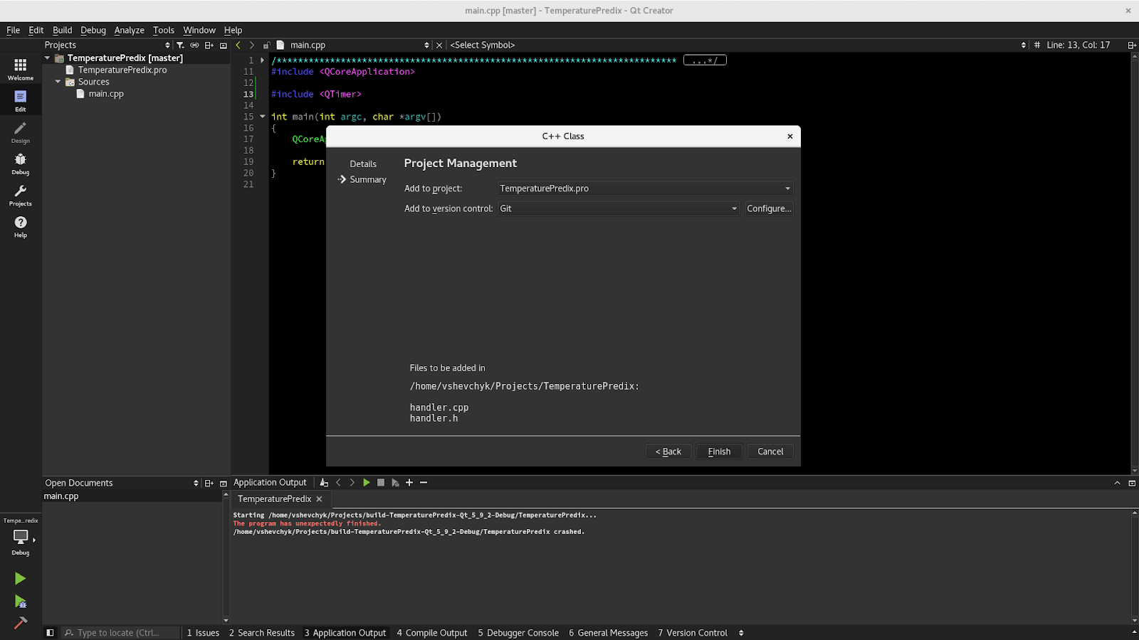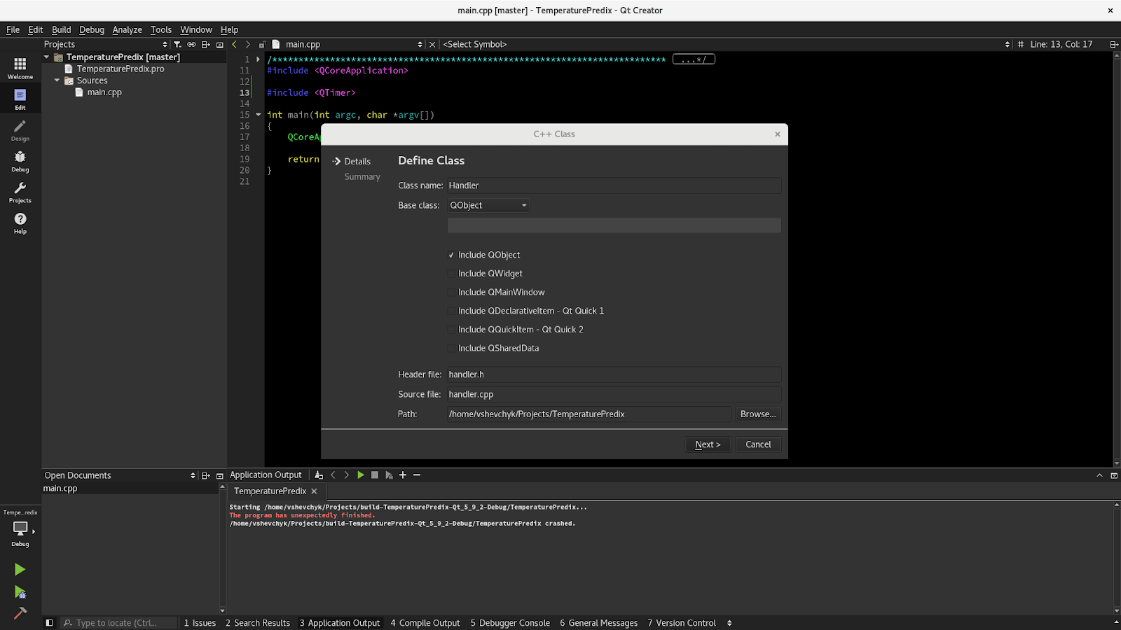Class QTimer implements the timer functionality, but in order to be able to use its signal timeout() that fires in due time, we need a class that implements slots. So let’s create our class named Handler.