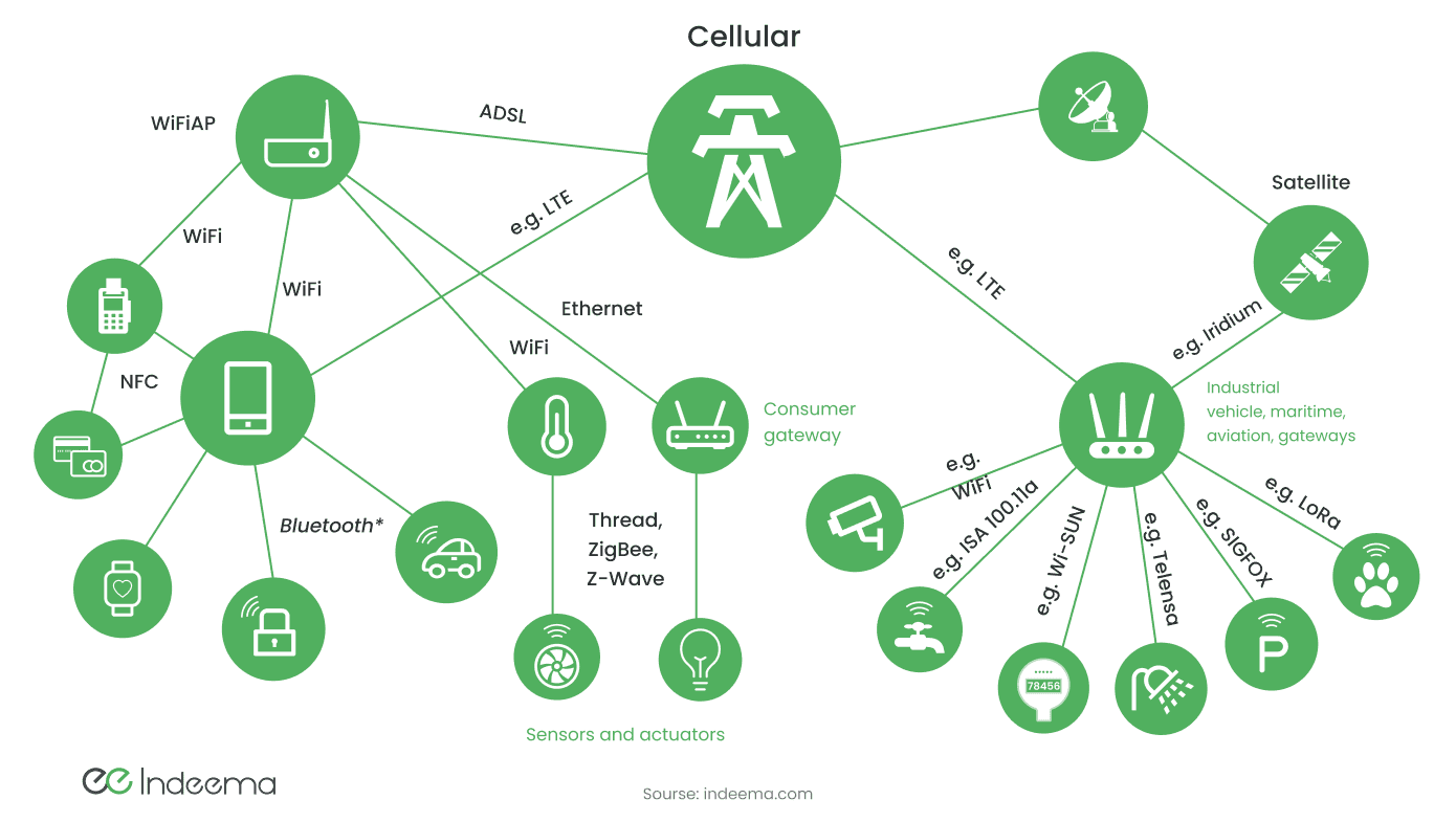 Consists of low-power short-range devices (SRD), which communicate within a few hundred meters. Such devices have little effect on the operation in the working frequency range, as their transmitter power limit is around 25–100 mW or less. Short-range wireless technologies include well-known common protocols such as Bluetooth, Wi-Fi, near-field communication (NFC) and lesser-known but IoT important standards, such as IEEE 802.15.4 (the basis for Zigbee, ISA100.11a, WirelessHART, MiWi, 6LoWPAN specifications and other wireless personal area networks (WPAN)), or Radio-frequency identification (RFID). You can find more interesting information about RFID tags in our article.
