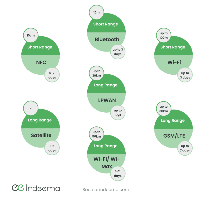It is worth assessing which networks and approaches are most applicable to IoT tasks. The main data transmission technologies parameters we are interested in are the distance at which data transmission operates, the power consumption of the device with the transmitter, or standard battery "life" (we will represent the time based on the fact that a standard battery has a capacity of 5 W*h), and the volume or speed of data transfer.
