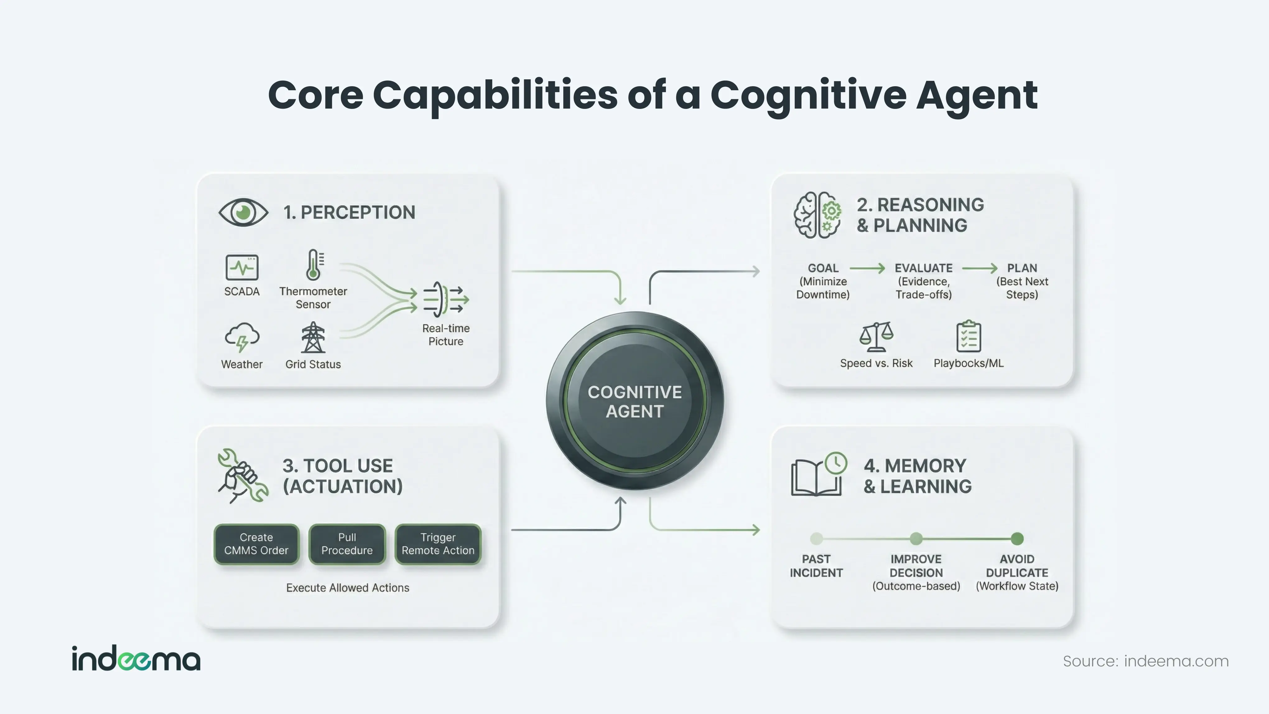 A cognitive agent works through four simple capabilities that mirror how an experienced operator thinks and acts: