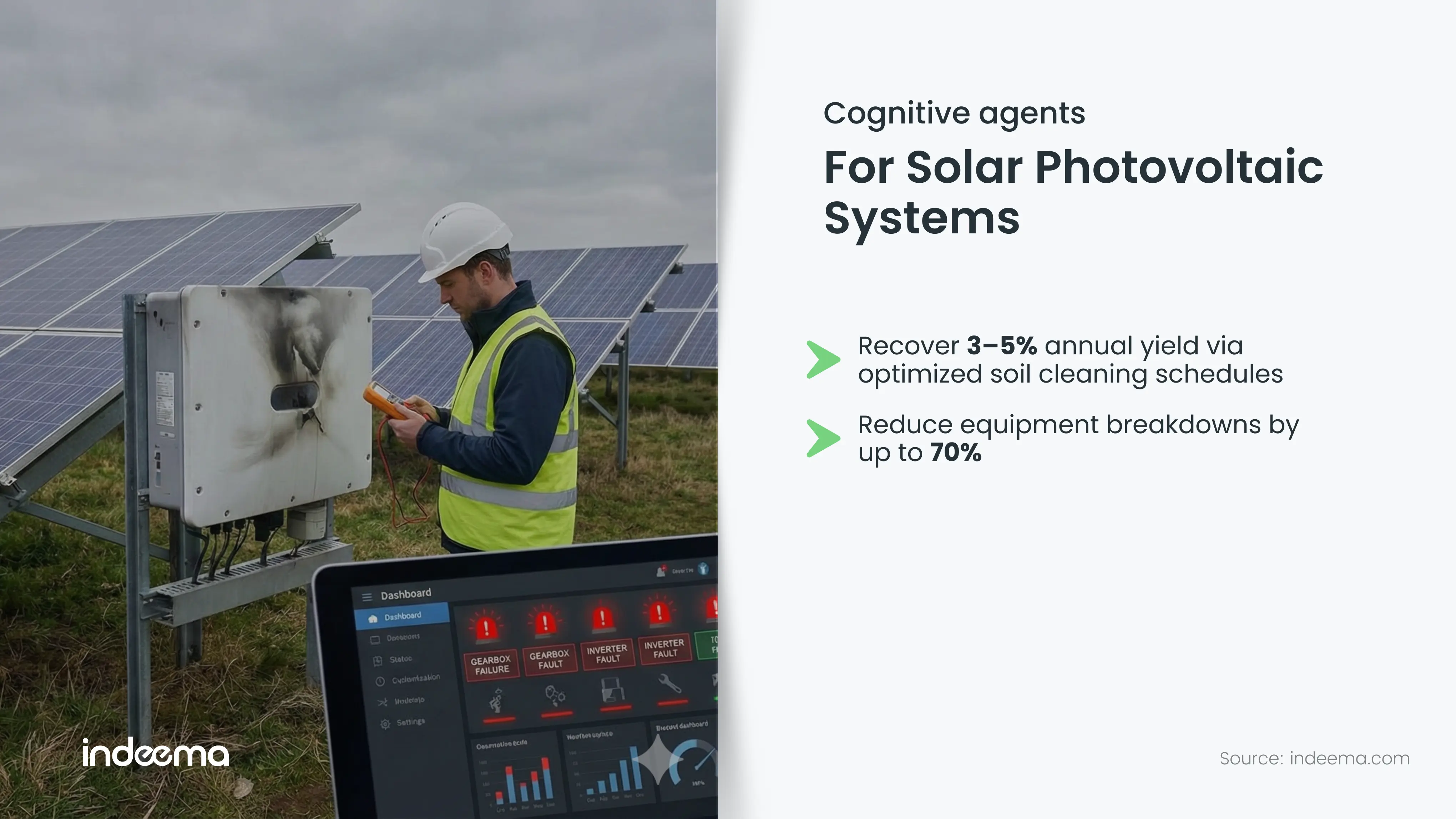 - Soiling & Vegetation Management: Agents analyze the Performance Ratio (PR) of strings correlated with satellite precipitation data. They calculate the exact economic "tipping point" where the cost of a cleaning crew is outweighed by the recovered energy revenue, automating the dispatch of cleaners or robotic wipers.