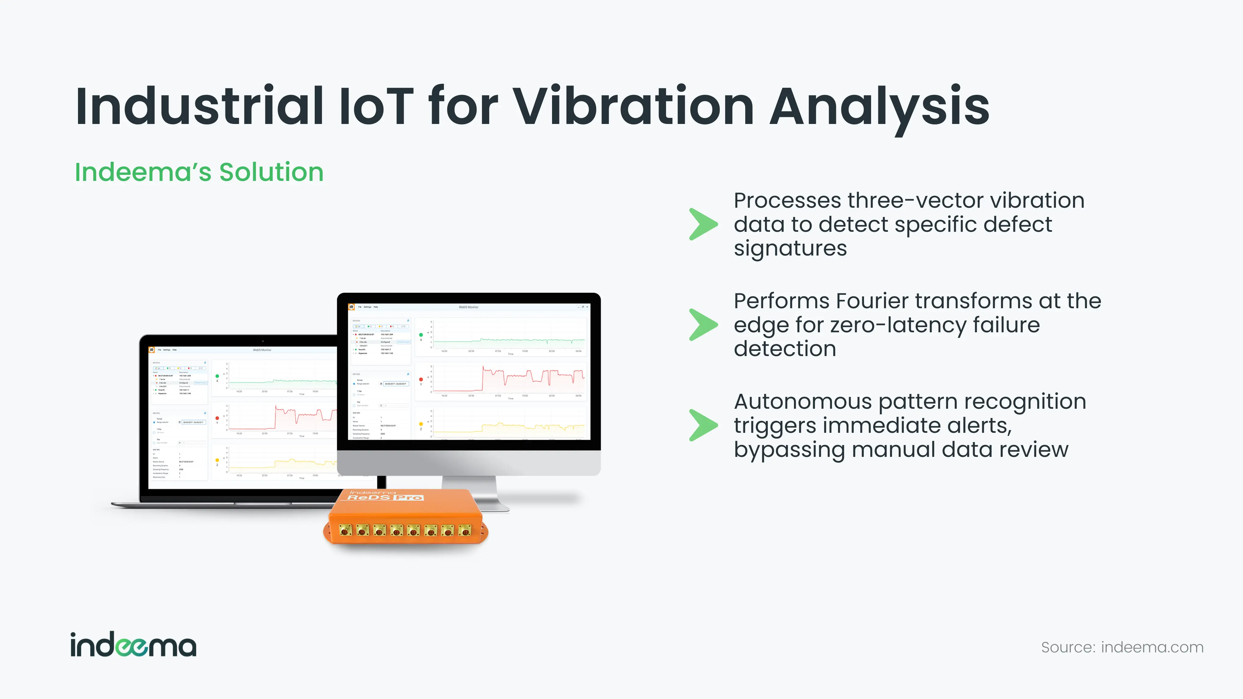 Indeema developed a solution for processing three-vector vibration data from high-performance accelerometers. This project highlights how specialized IoT development is critical for enabling the 'Edge Perception' capabilities required by wind turbine drivetrains.