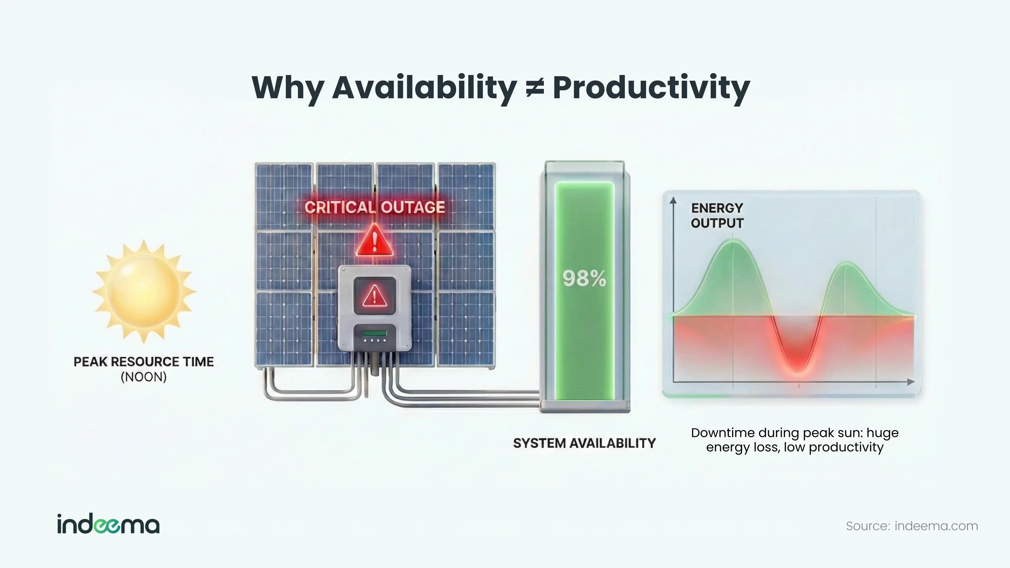 Renewables operators often talk about availability – the percentage of time an asset is capable of running. It’s possible to have a high availability rate yet still lose a lot of energy. How? Because a short outage at the wrong time can cause a big production loss.