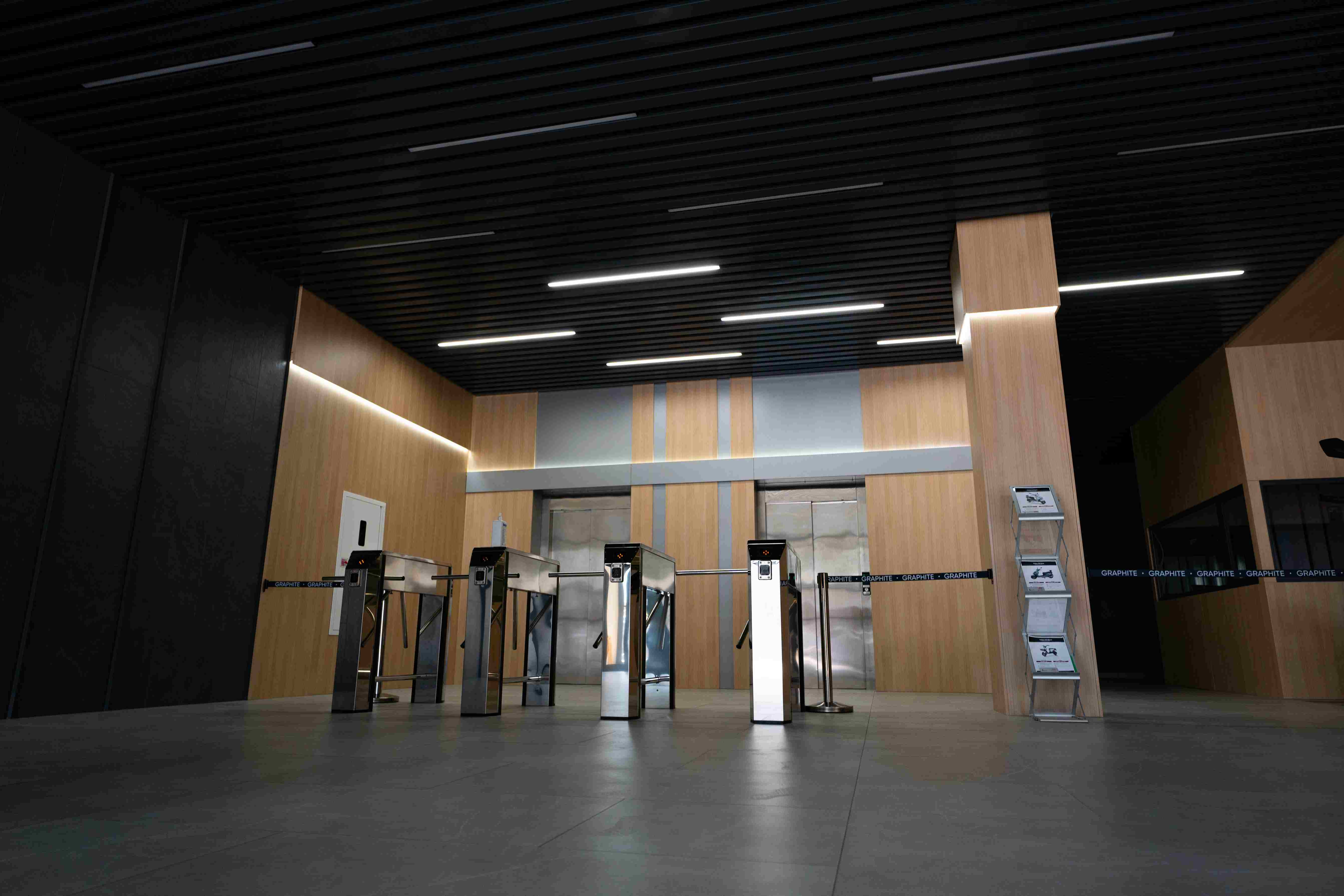 Another significant detail we have not mentioned yet is parking: both underground and surface parking is available right beneath the office building. Of course, there is bicycle parking to support our employees' healthy lifestyles. To put it another way, drivers are satisfied. And as soon as we walk into the office building, we are greeted by a lavish lobby.