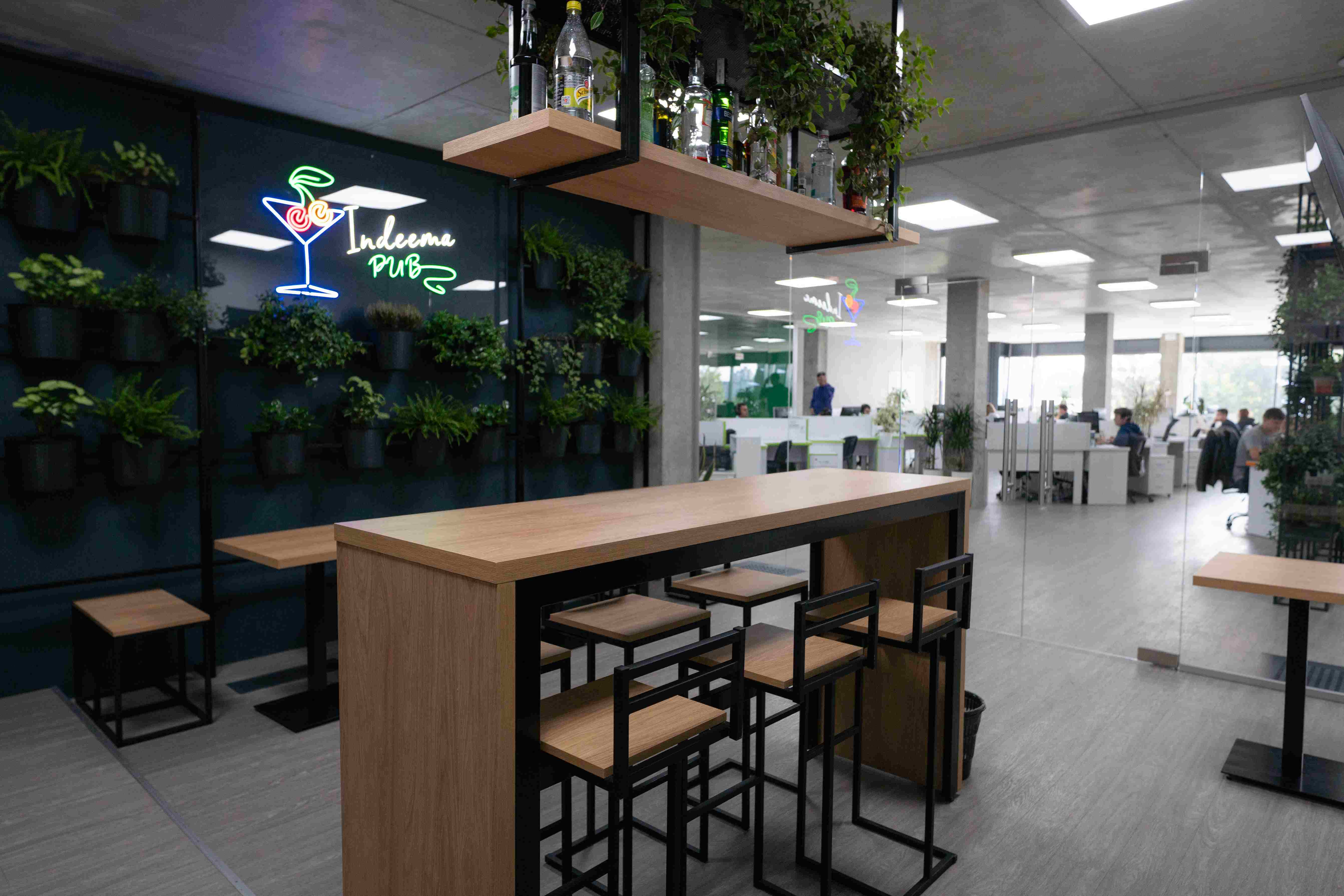 “Our Pub is my favorite place at work; I always go out for coffee and meet someone there, catch up on the latest news, crack jokes, and return to work in a great mood. But above all, I love our sign on the wall, since I remember how Taras, our designer, was drawing a layout on paper while we were debating which font to use, and now it hangs in front of me. This is an excellent example of how our ideas are embodied in a real-life.”- says Mariana Shevchyk, Head of the HR department at Indeema Software.