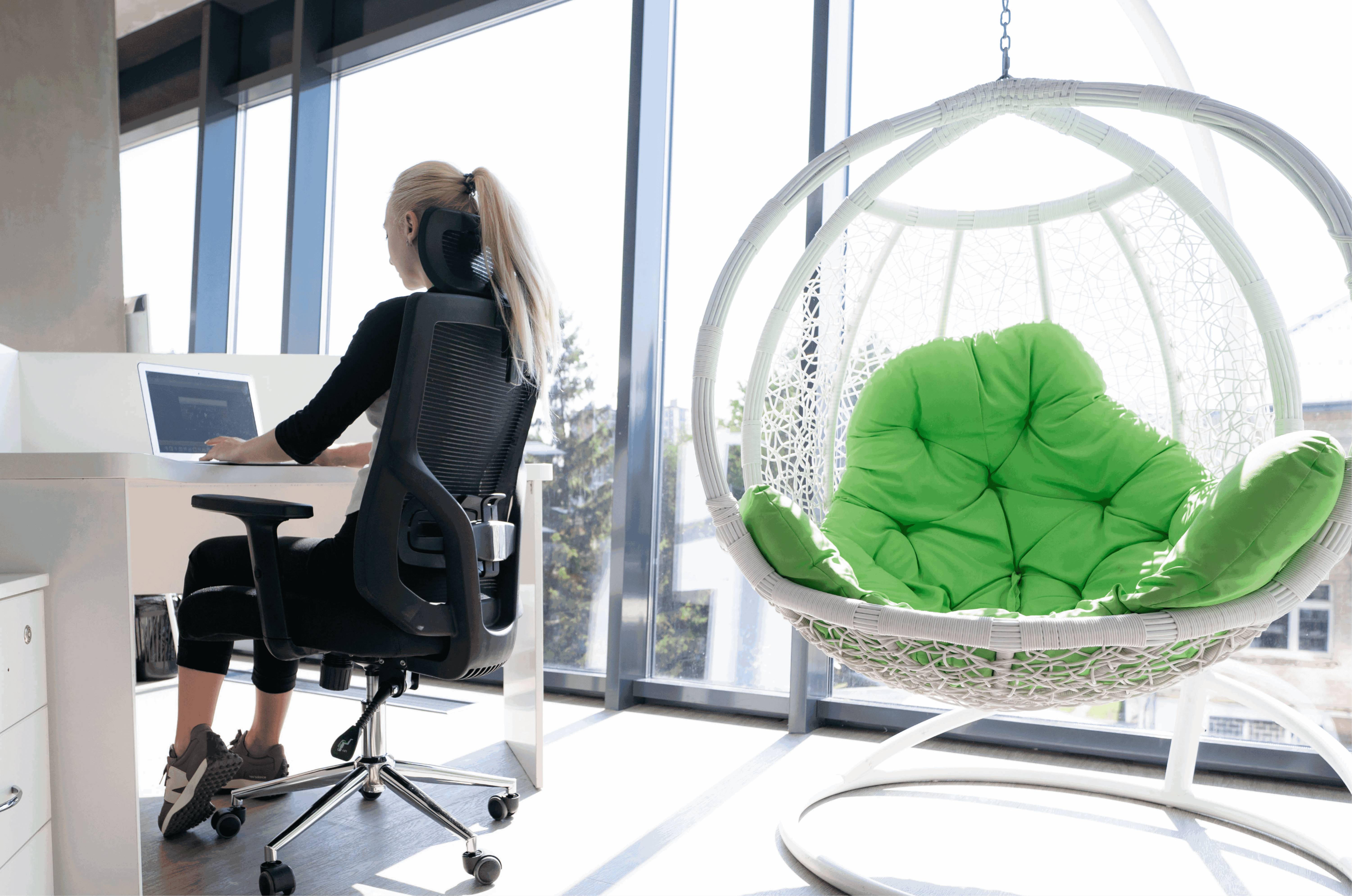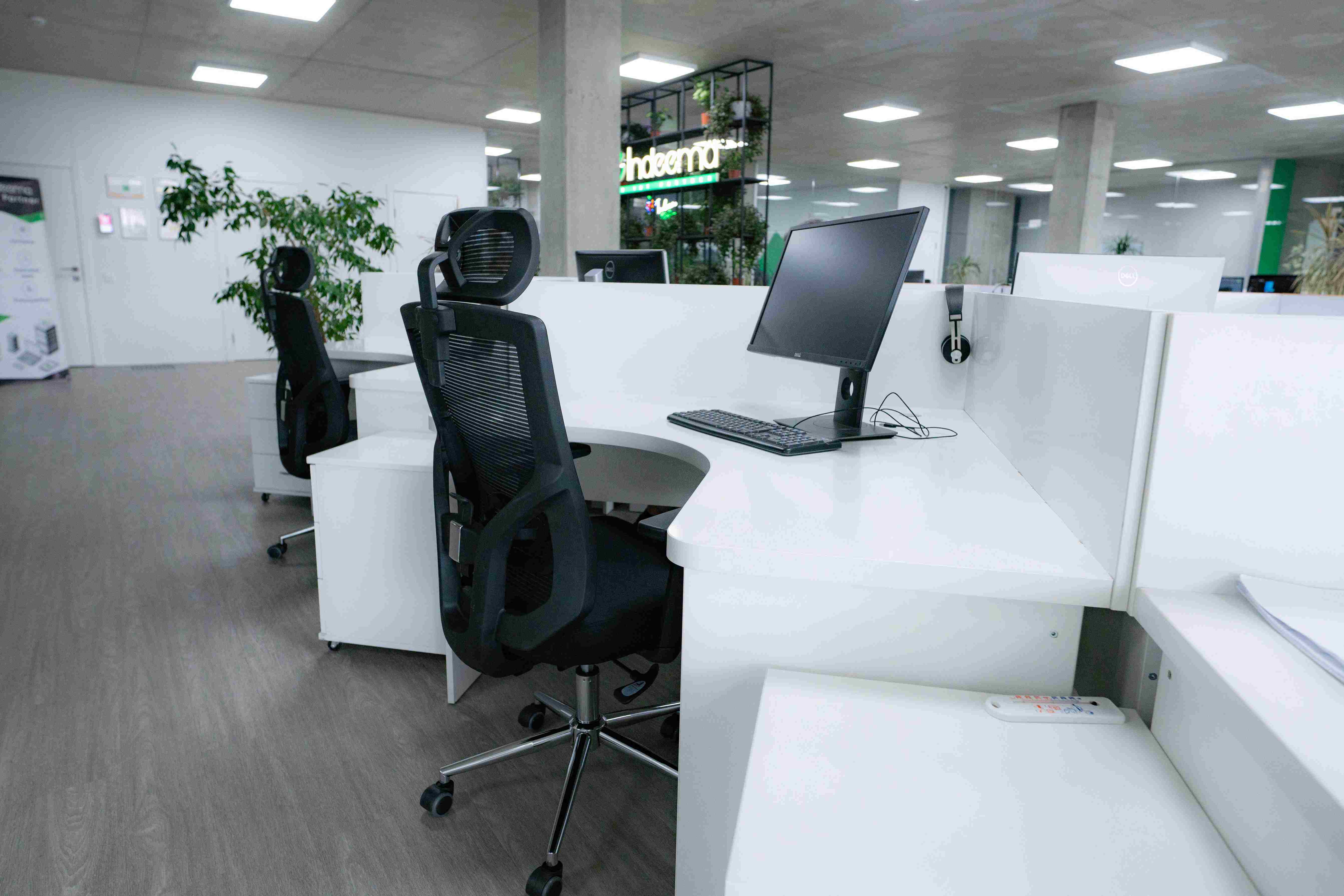 When it comes to personal space, everyone has their boundaries. But even if you and your coworkers are like one big happy family, having a separate working space is essential to feel comfortable and safe. We spend 40 hours a week or more at work, so the personal working area should be as comfortable as possible. We found that having the ability to put elbows on the desk is a crucial factor for most of us. For this reason, we have corner office desks, which add more privacy and form a "private bubble" around each team member. Of course, we didn't forget about the office chairs, which are on wheels and have headrests to make sitting more comfortable.