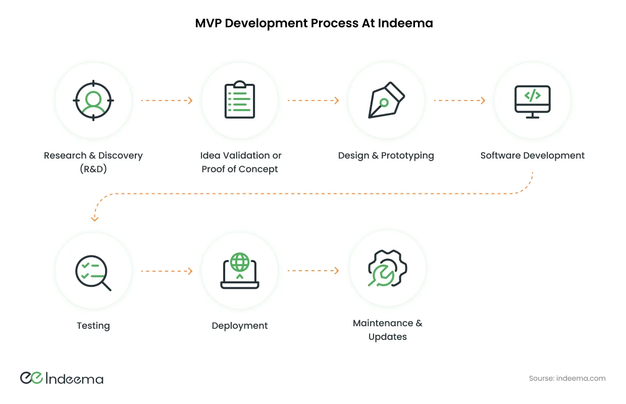 When considering the development of an IoT solution, we must discuss the standards. Because the diversity of the IoT field has not yet allowed the creation of a single universal standard for the entire industry, companies continue to develop their own internal standards for product development. However, as always, you can focus on the developer's Maturity Level. This level is dependent on stable processes and overall optimization of the company's development processes. For many years, Indeema has been optimizing the MVP development process for its clients. In our current approach, the following are the primary steps in MVP development: