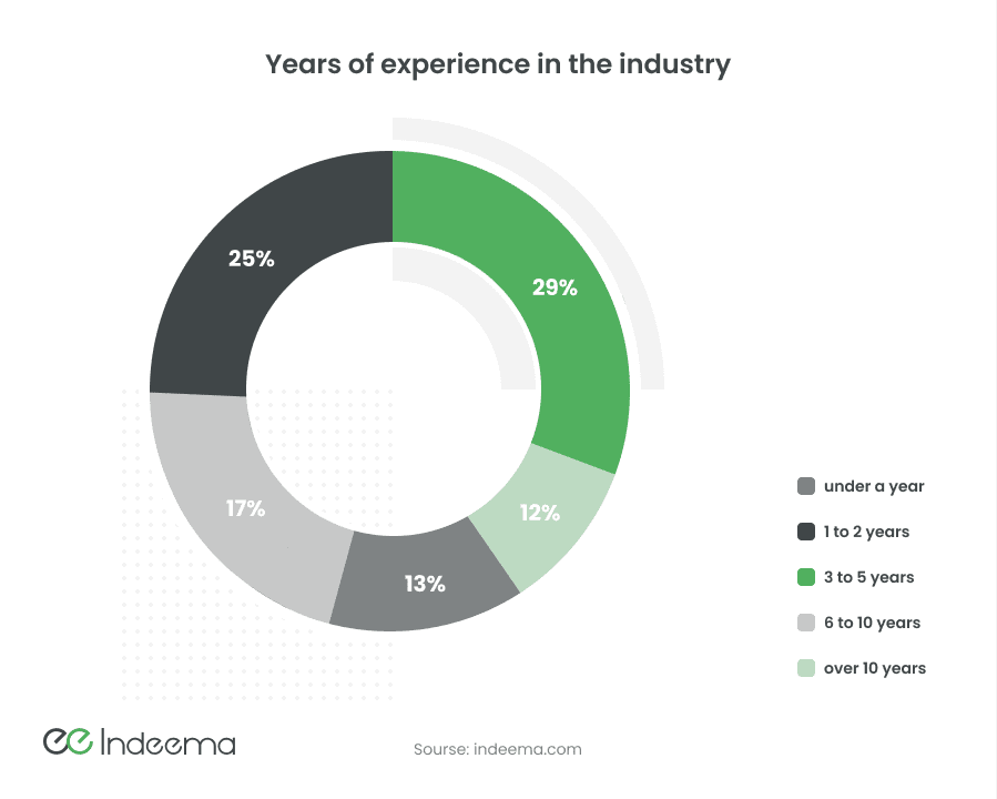 Most Ukrainian technology specialists also have many years of experience in the industry. On average they have: